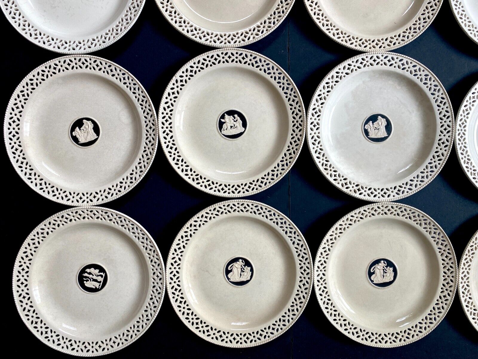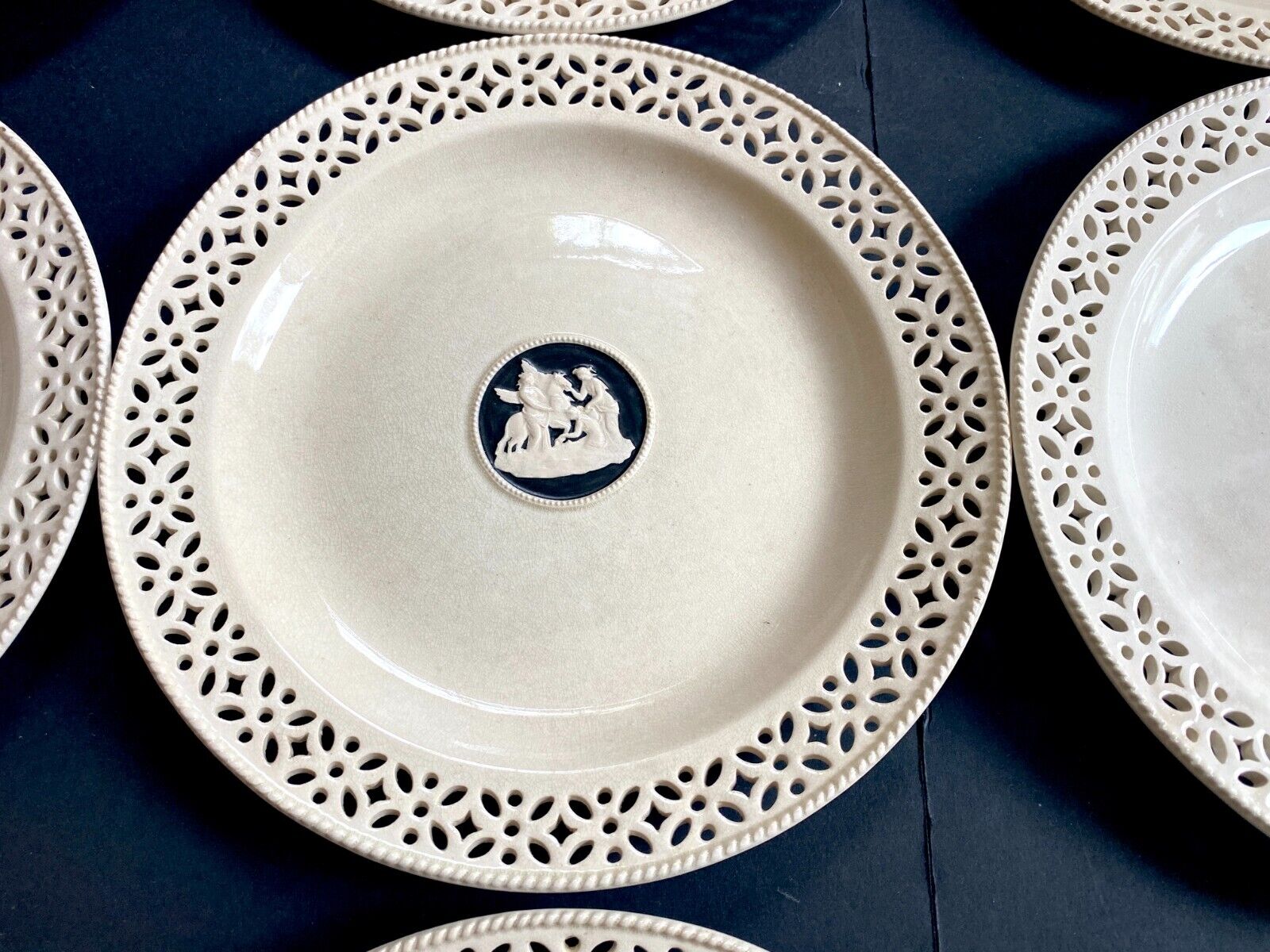 This listing features a set of 12 Antique Wedgwood creamware plates adorned with a charming pierced reticulated border and a central reserve depicting classical figurines.