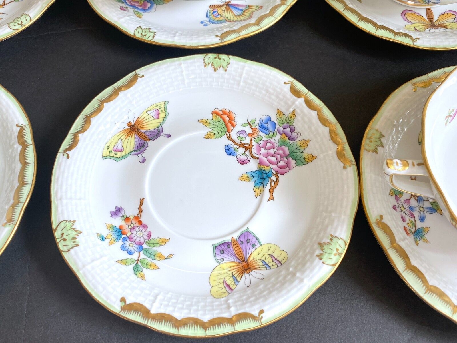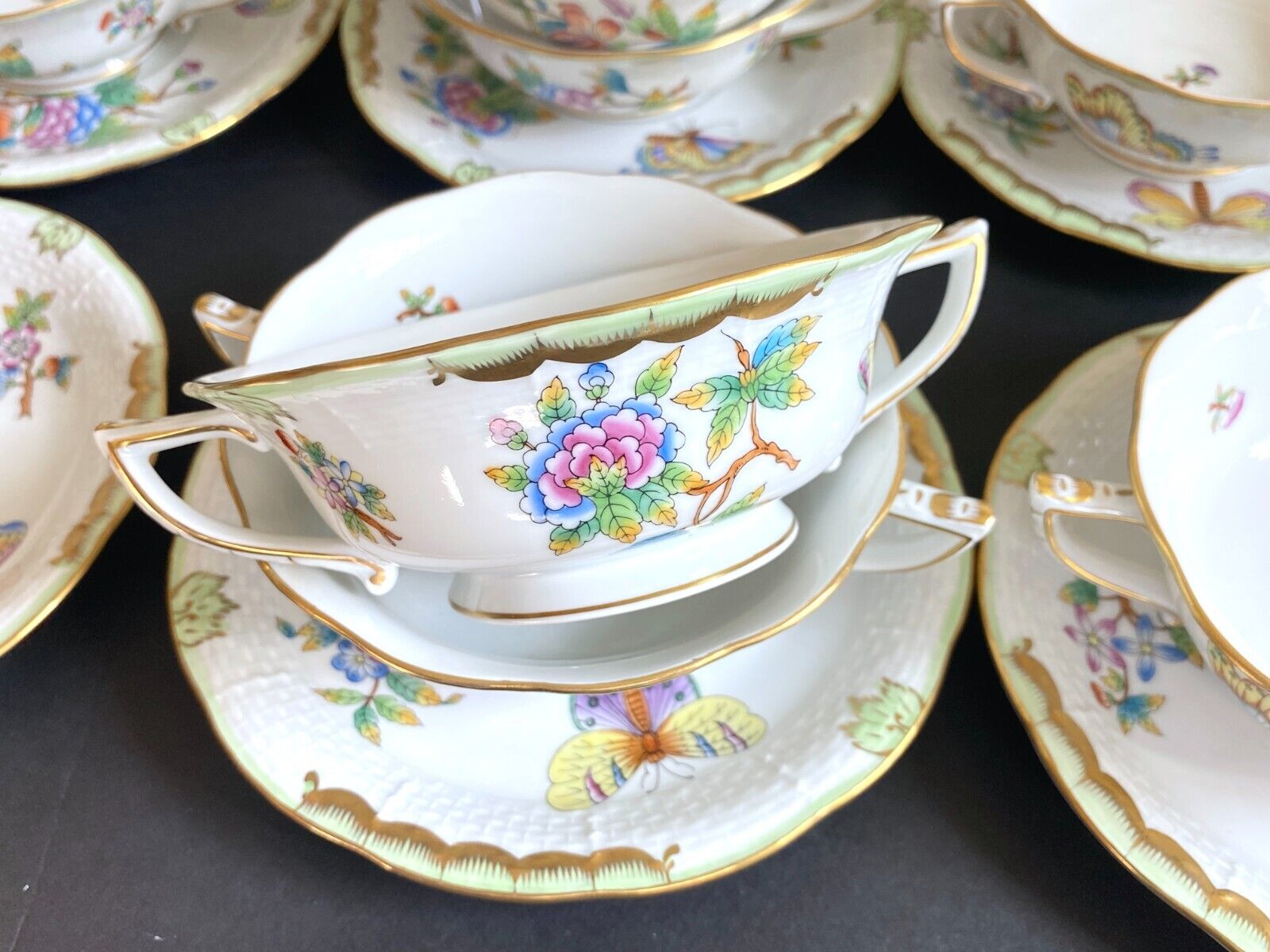 Twelve exquisite Herend Hungary "Queen Victoria" bouillon soup cups, complete with its matching saucers, is in mint condition. The piece is beautifully adorned with hand-painted peony flowers and butterflies,