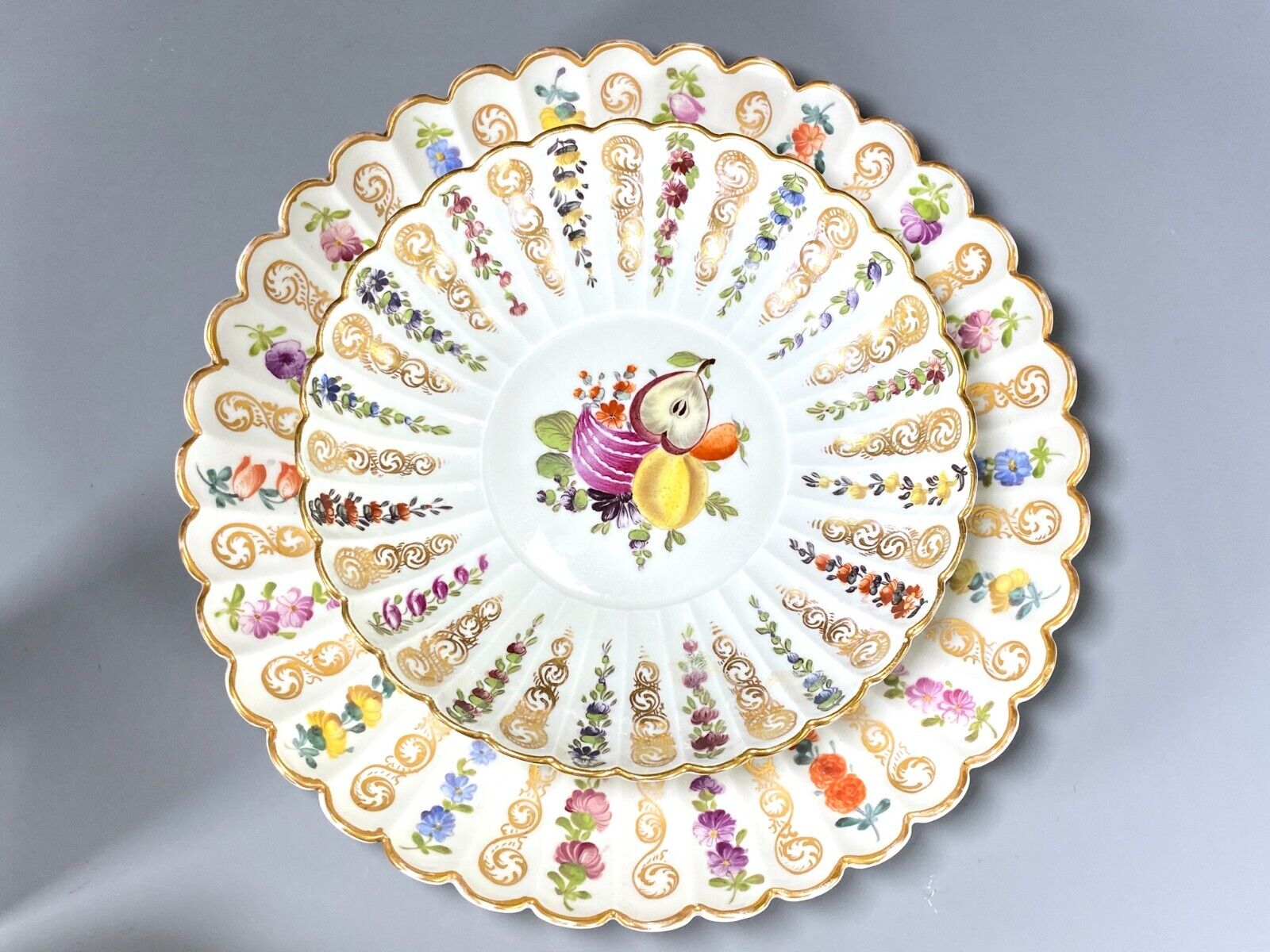 A magnificent pair of MEISSEN Round serving bowls, polychrome floral and fruit painting, ornamental gilding, 19 century, very rare decoration! with underglaze blue crossed swords