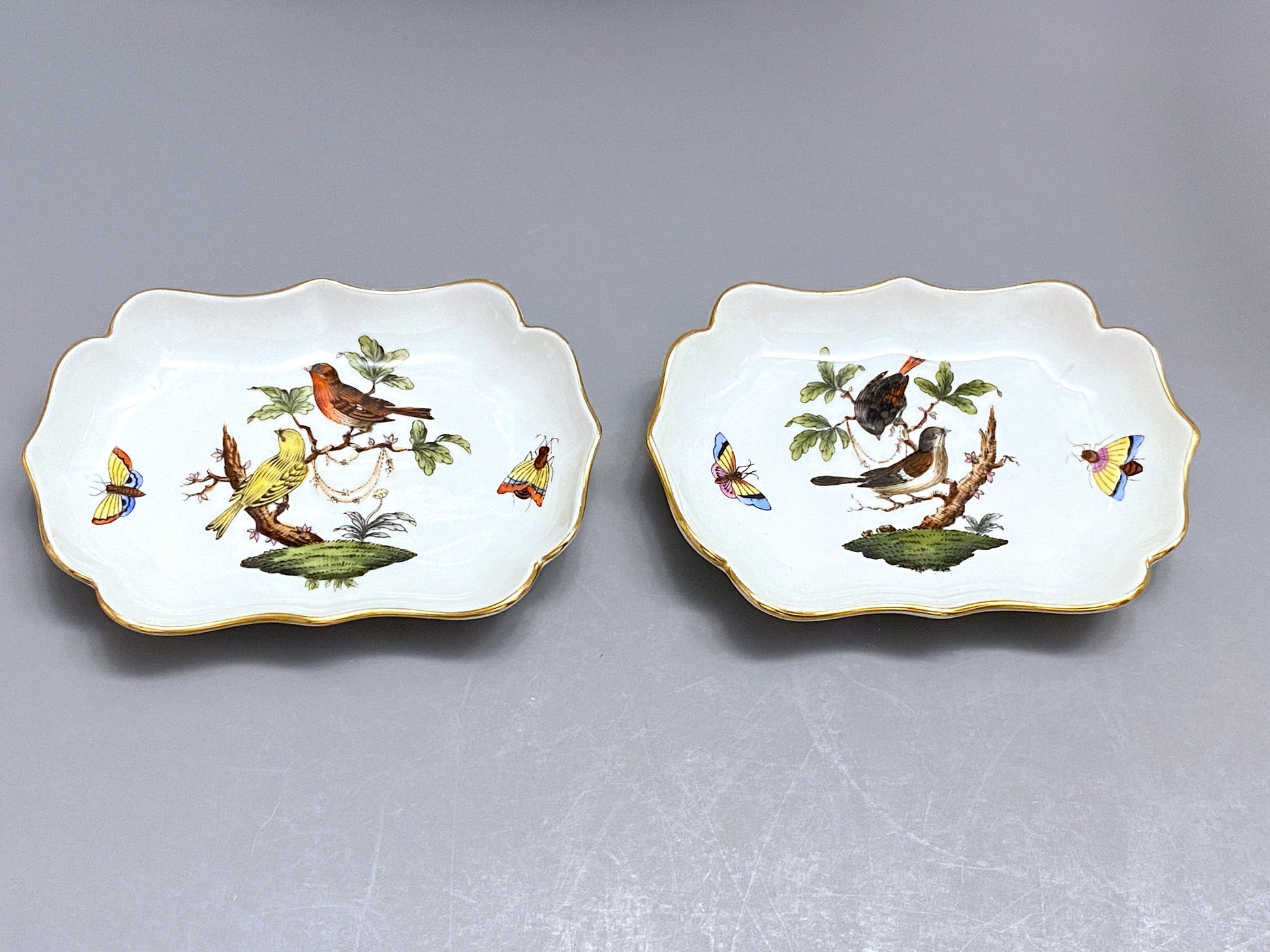 5x Herend Rothschild Bird small dishes, excellent, lovely gift or collection, pattern number: 7798/RO (3 oval dishes) and 7784 /RO (2 rectangular dishes)