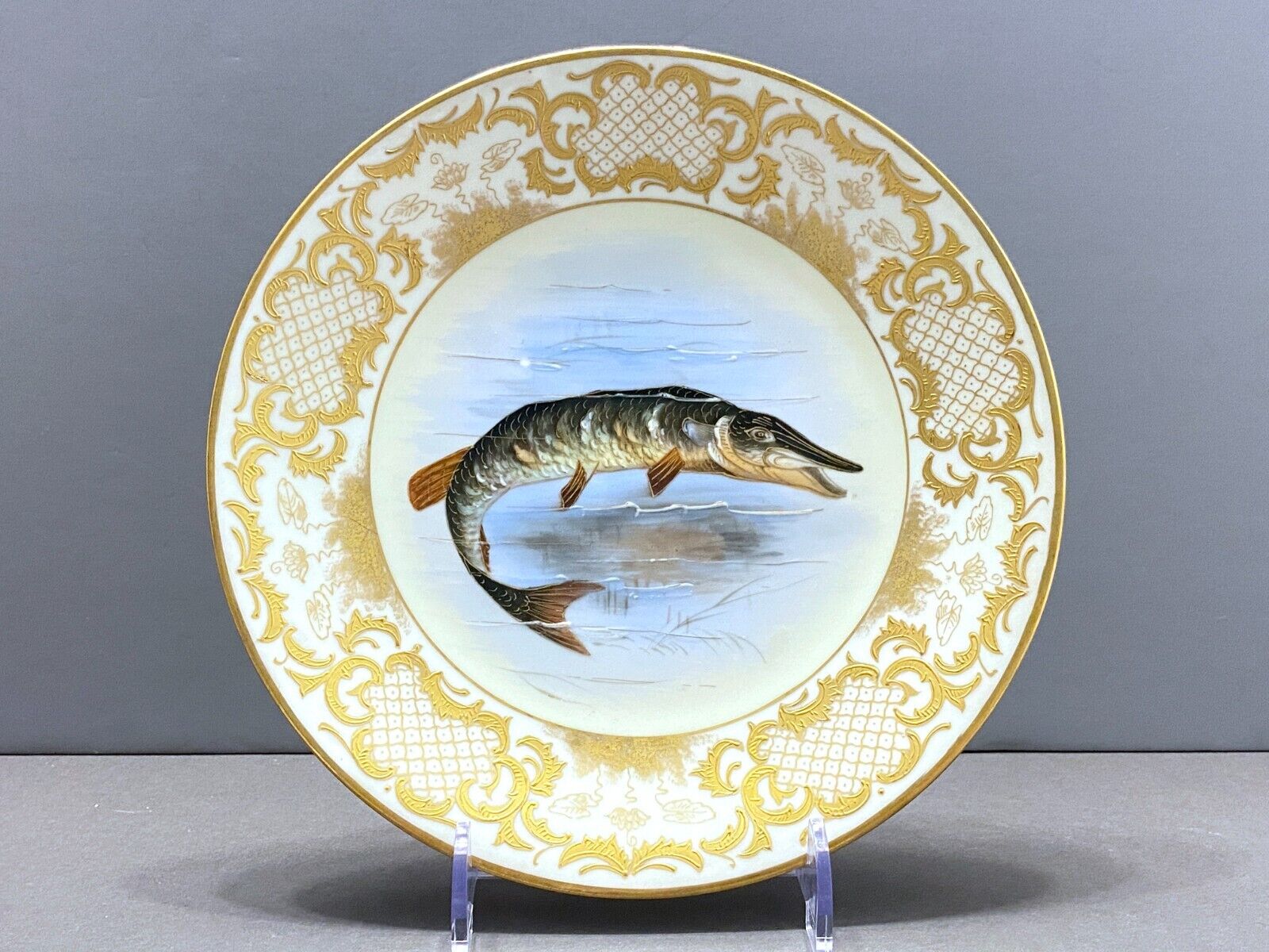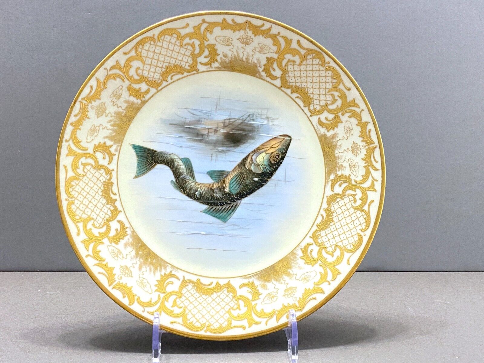 This set of antique plates features beautifully hand-painted depictions of fish against blue waterscape backgrounds. The fish are rendered in exquisite detail, showcasing their scales, fins, and distinct colorations. The plates have an ornate gold border with an intricate pattern reminiscent of the Imperial Vienna style. The plates are encrusted with gold accents and the fish imagery is hand-patinated, giving them a vintage, almost three-dimensional appearance. This set of six plates, dating back to the early 1900s, was produced by the renowned Limoges porcelain manufactory for Ovington Brothers of New York, making them a true collector's item.