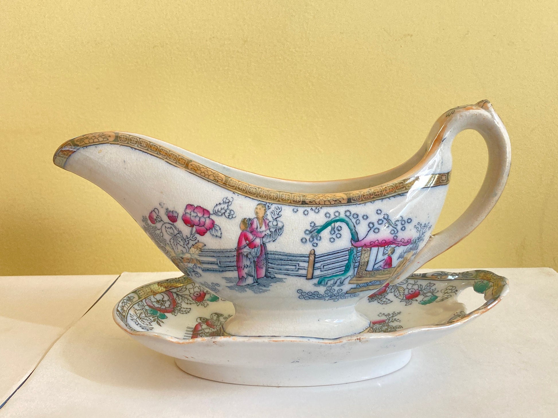 Antique Ashworth LSS Lewis Strauss & Sons ironstone gravy boat with underplate in Chinese pattern, ca. 1860
