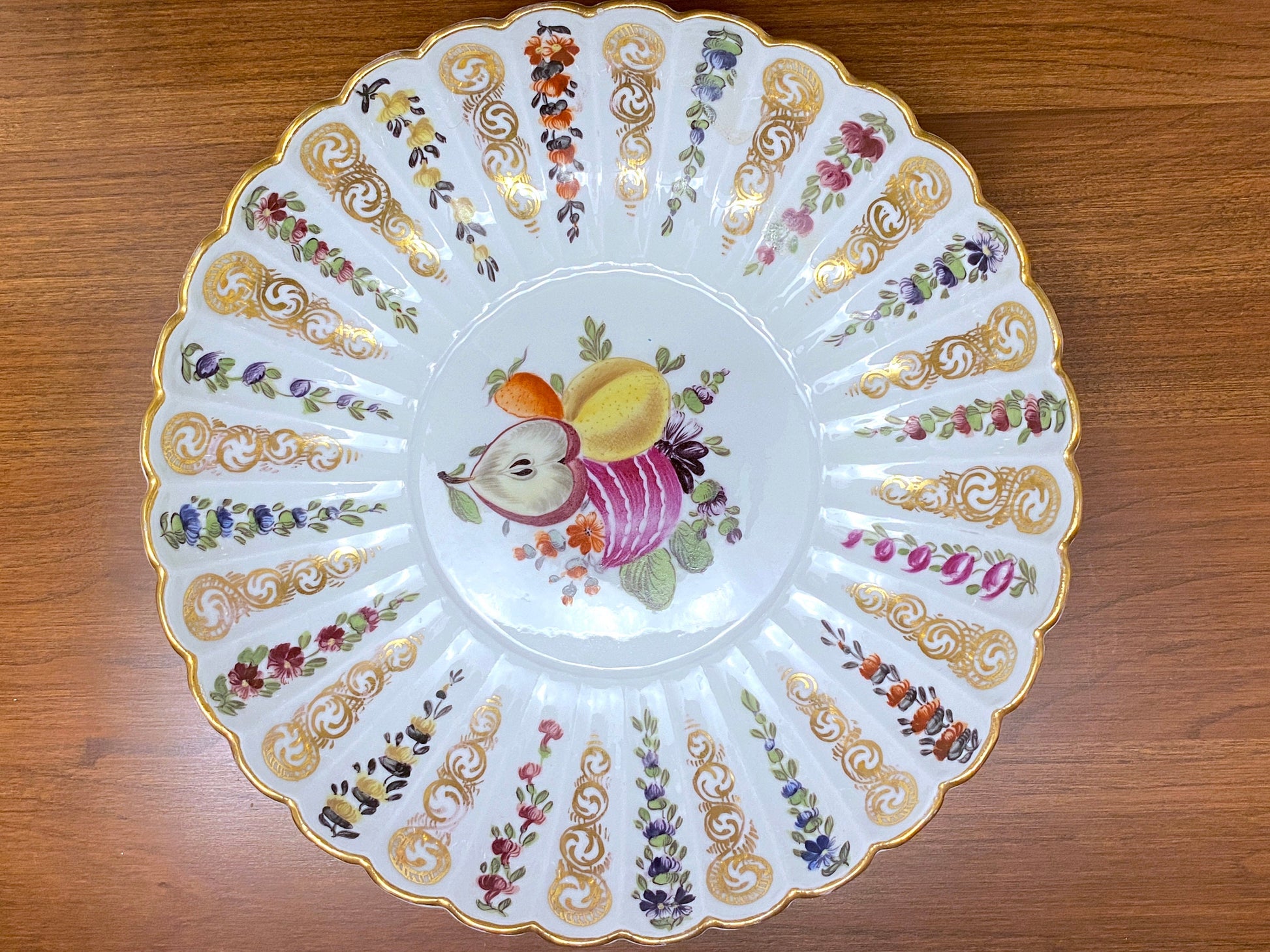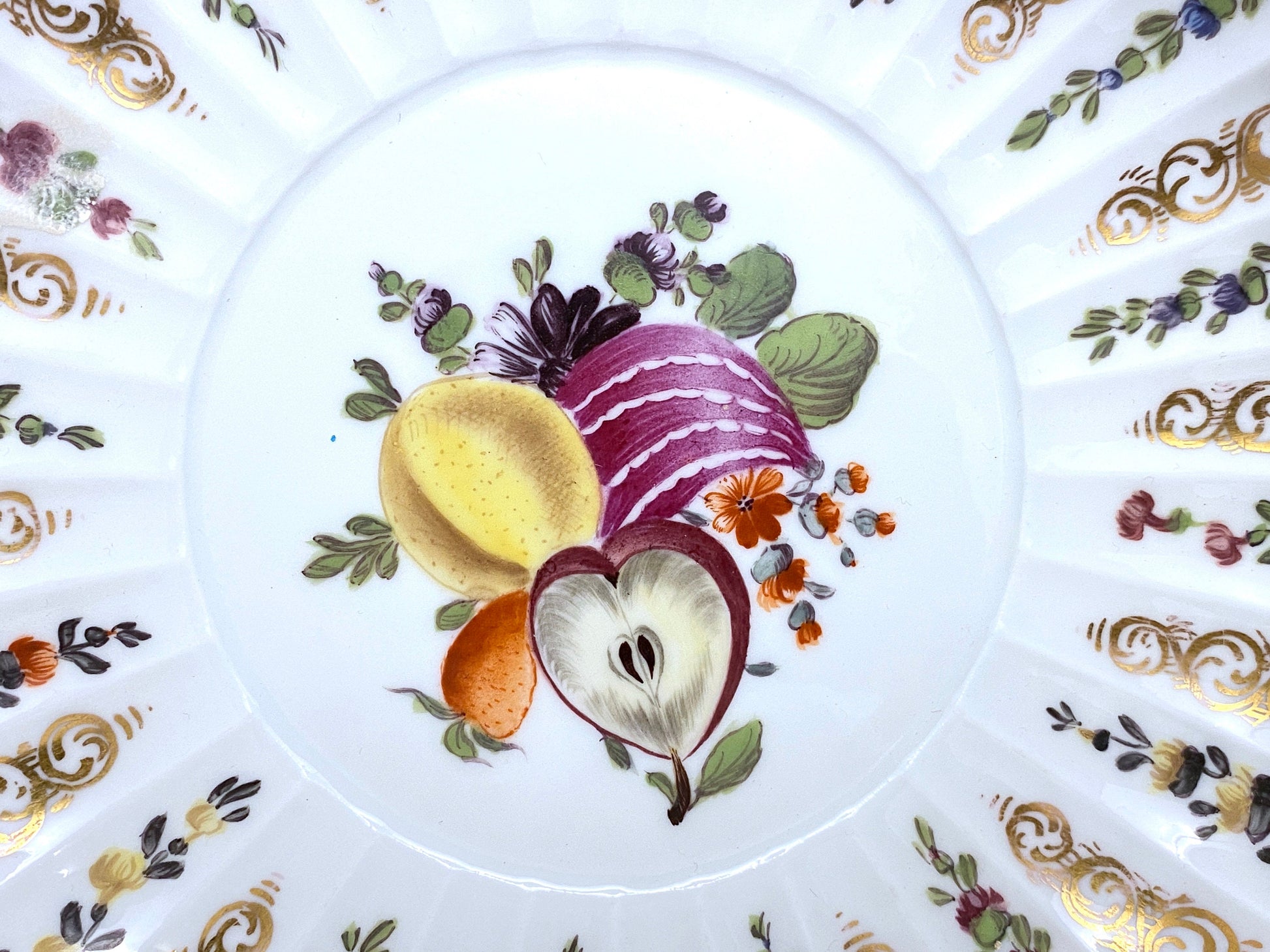 Antique MEISSEN bowl, polychrome floral and fruit painting, flute design, ornamental gilding, 19 century, very rare