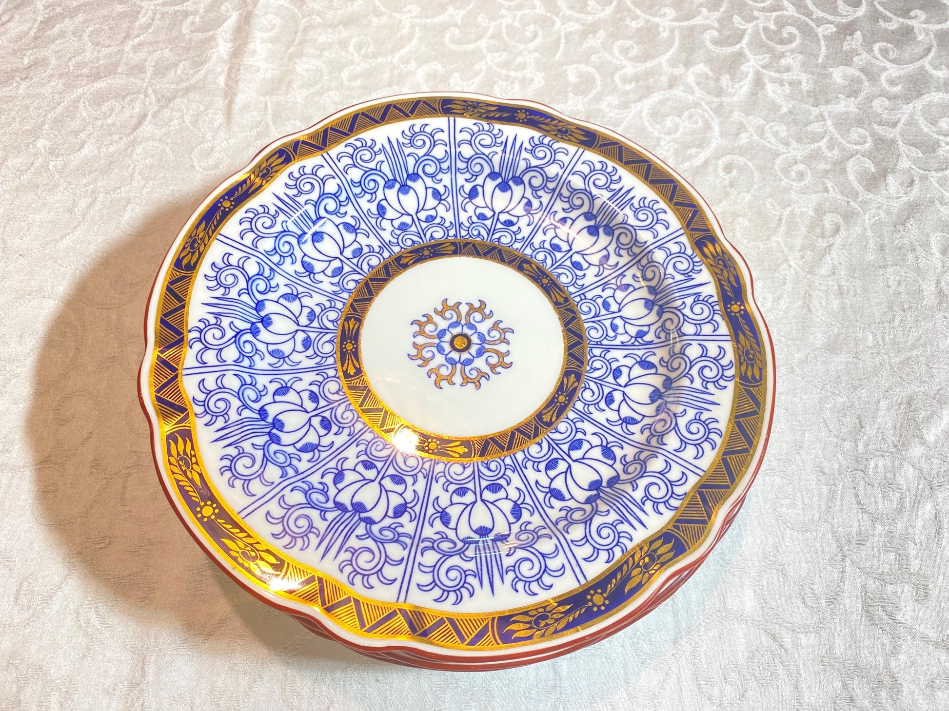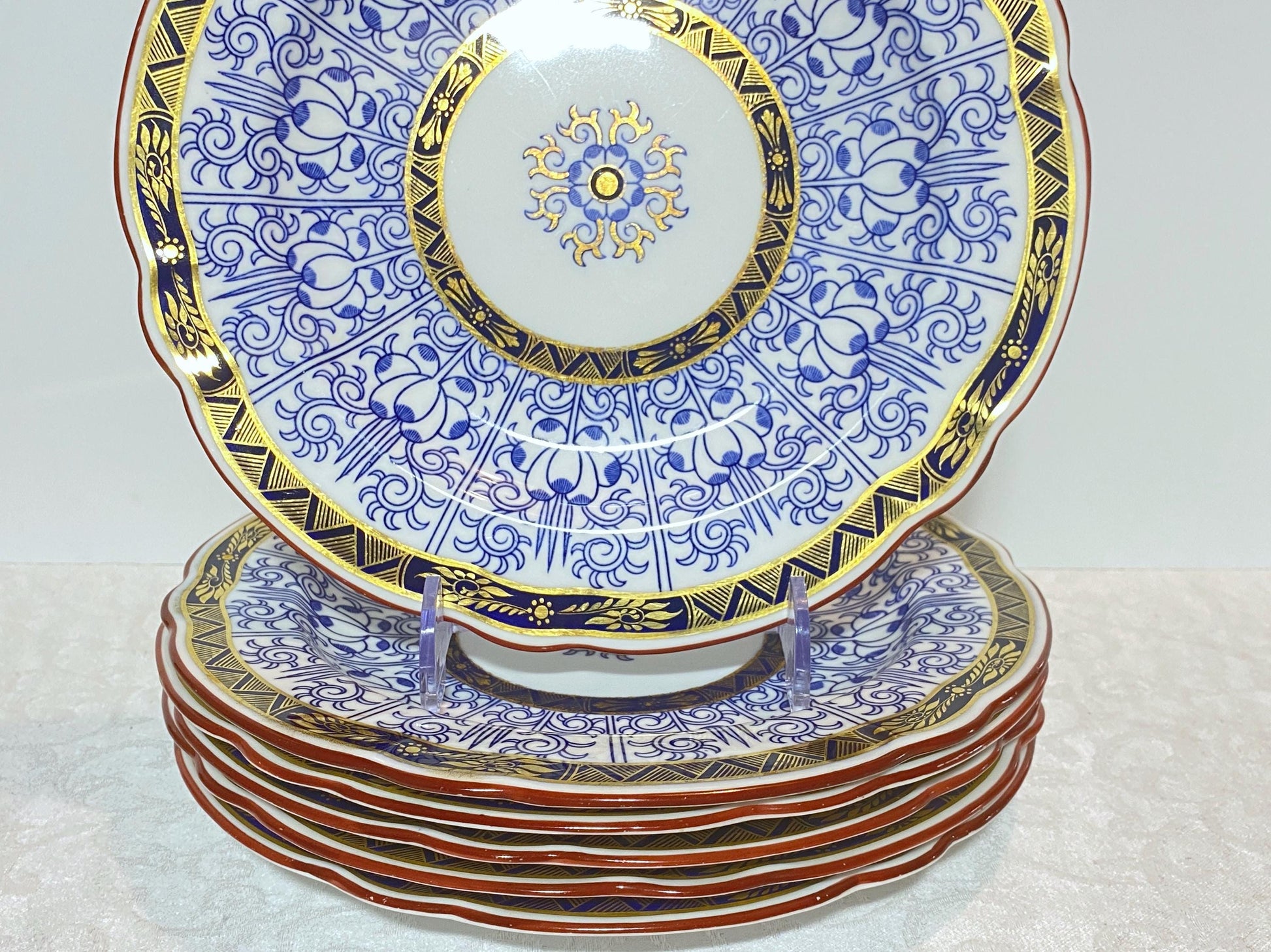 Antique Royal Worcester English Porcelain blue and white "Royal Lily " dinner plate, set of 6, rare scalloped edges,Circa 1906,