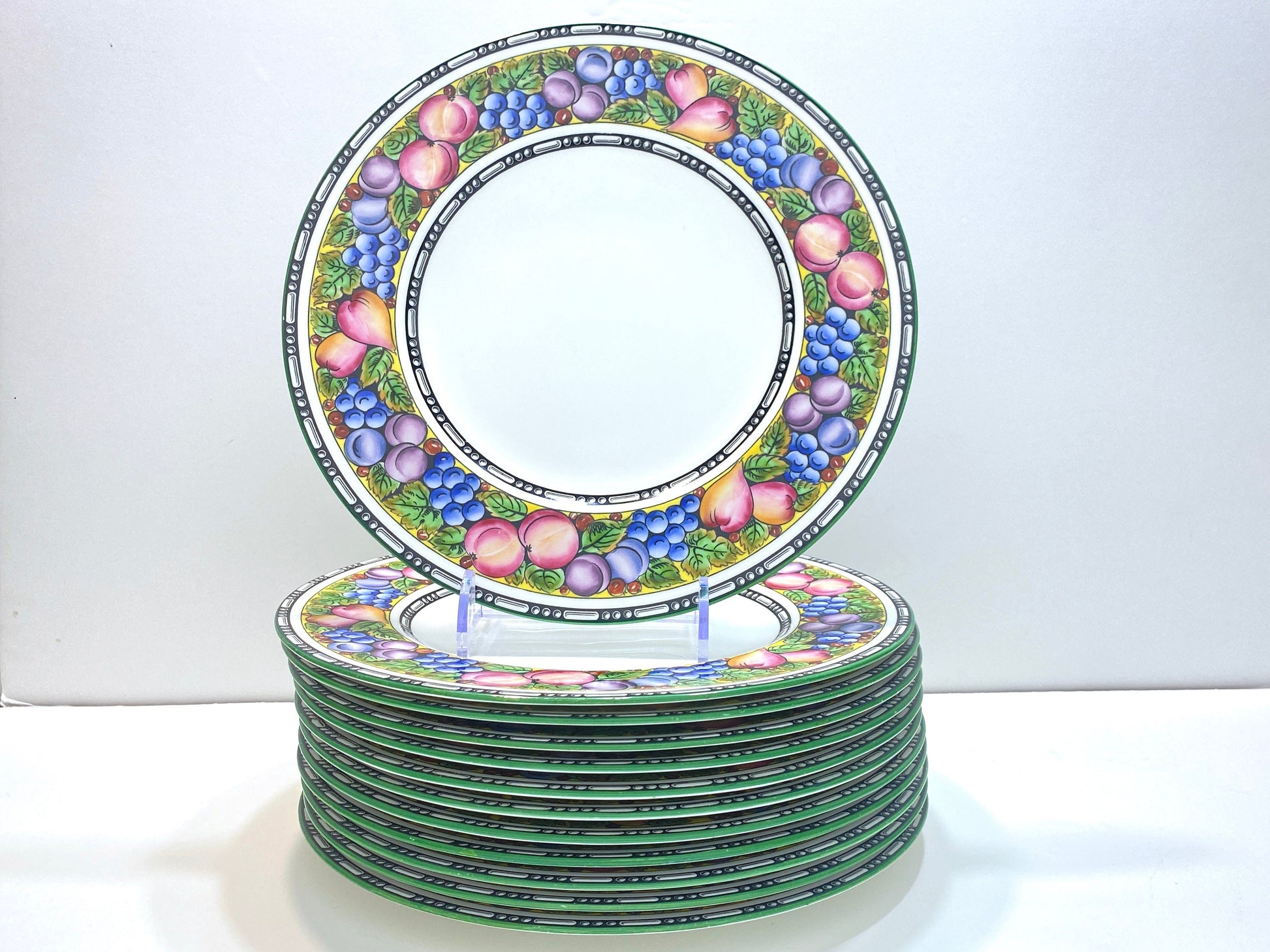 Antique Wedgwood bone china dinner plates, set of 12, fruit border and green rims,10.5/8 inches, circa 1902, excellent