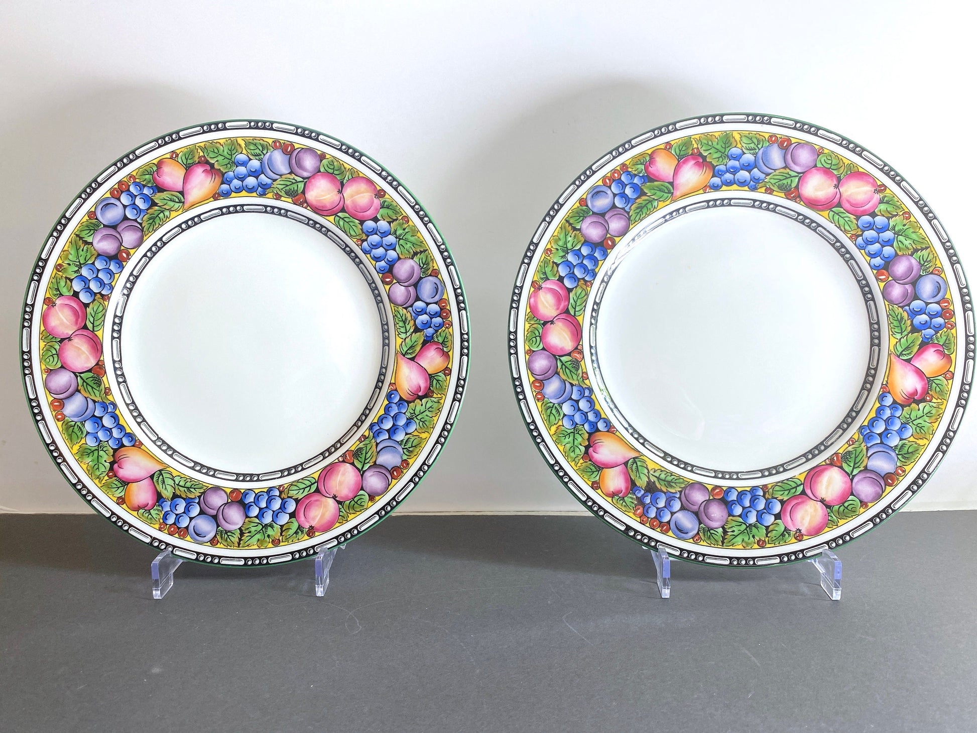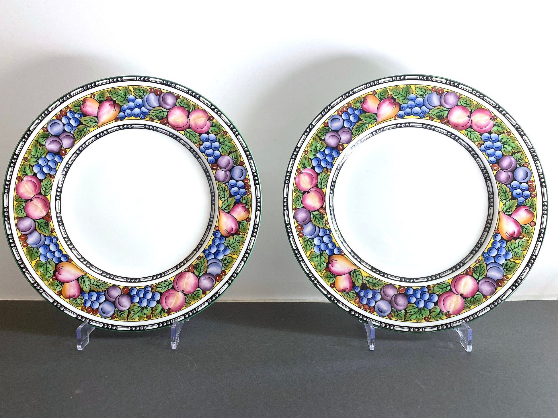The border design is intricately detailed, with the lush fruits and foliage encircling the plate in concentric rings outlined in black and green rimes. The bright, warm-toned fruits pop against the crisp white porcelain background