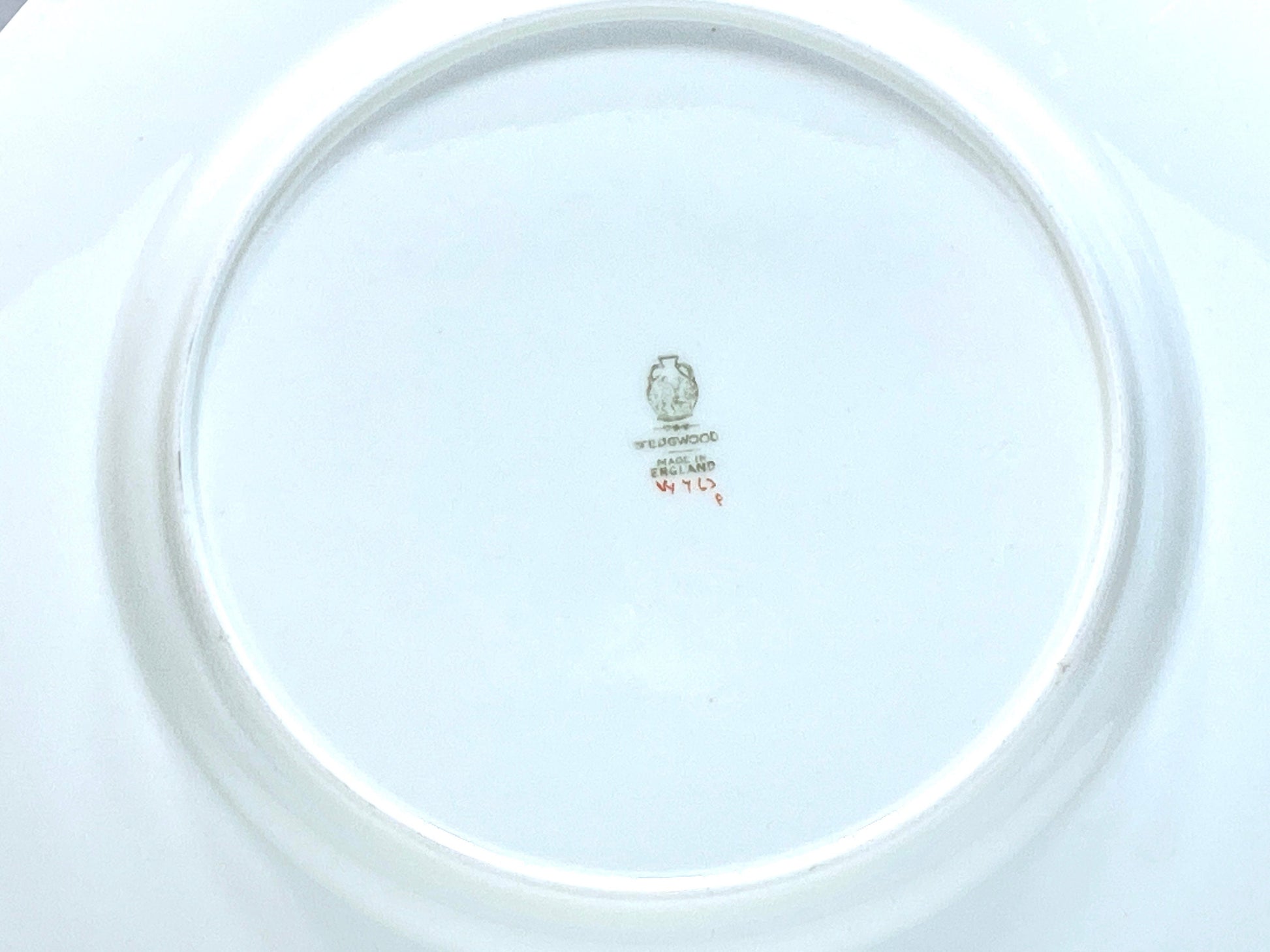 Each plate measures approximately 10 5/8 inches in diameter. On the underside, the plates bear the green Wedgwood backstamp