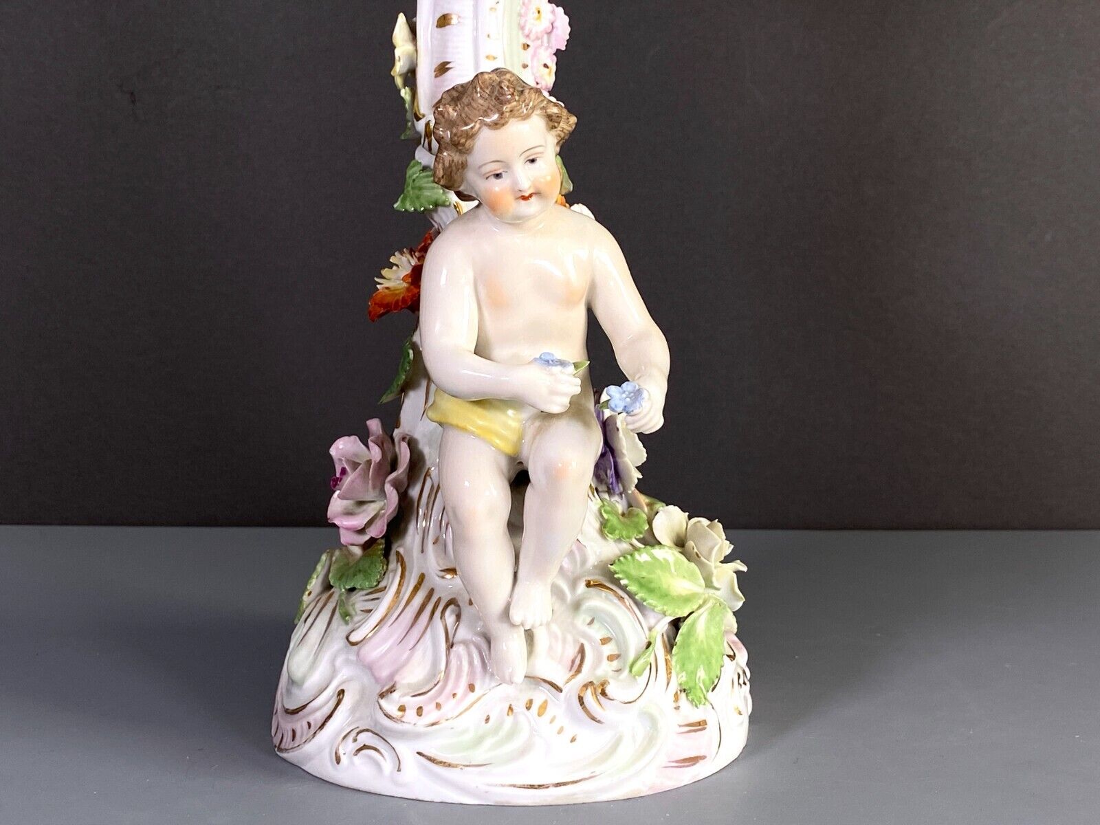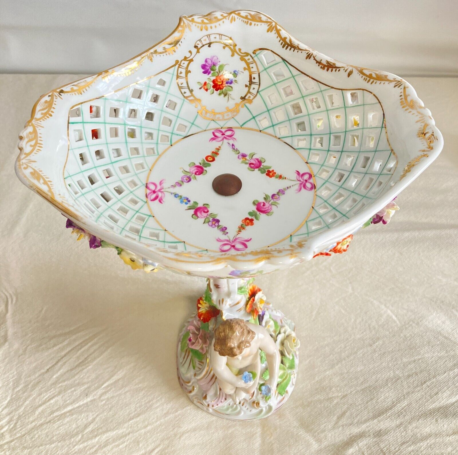 This stunning Germany Carl Thieme Dresden Potschappel porcelain figural centerpiece with pierced bowl and gold accent is a true work of art, crafted with incredible skill and attention to detail. Dating back to around 1910, this antique piece features a cherub sitting on the base with a flower in his hand.