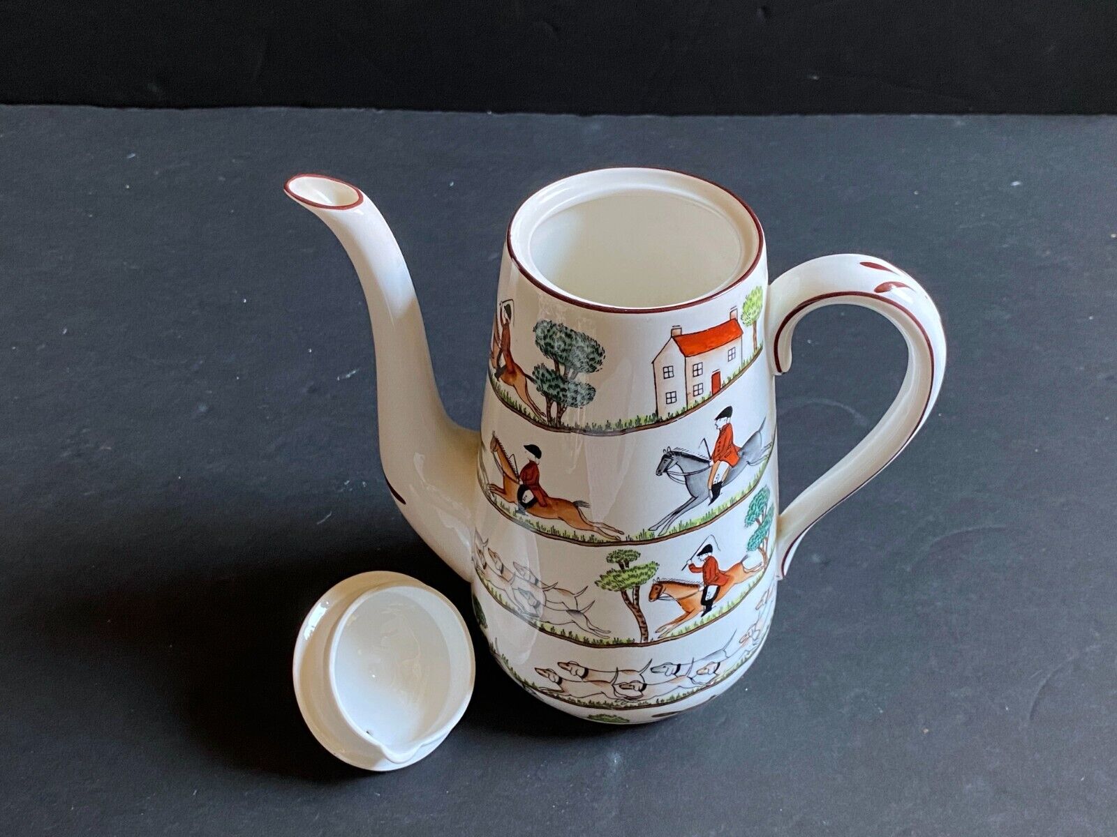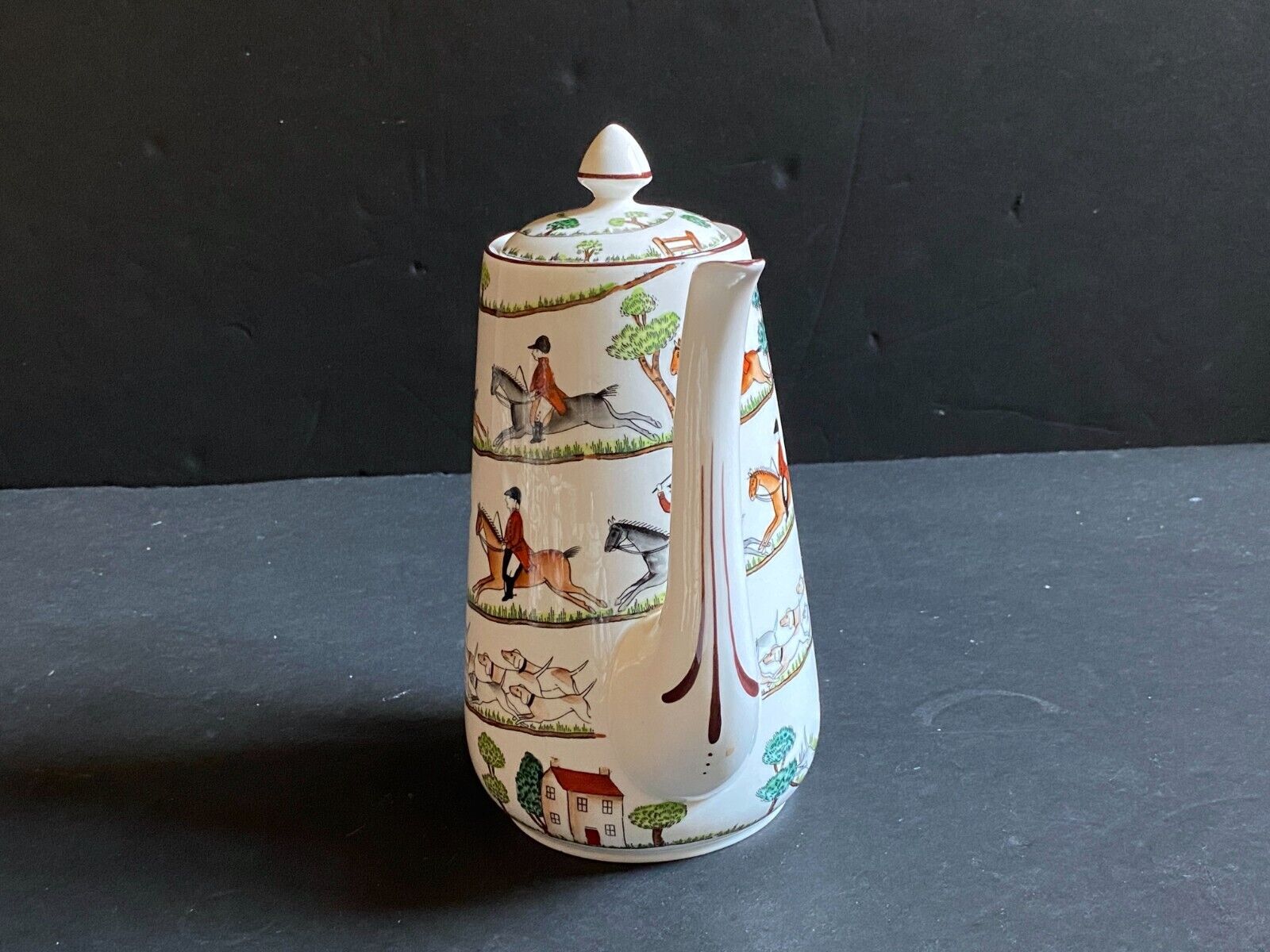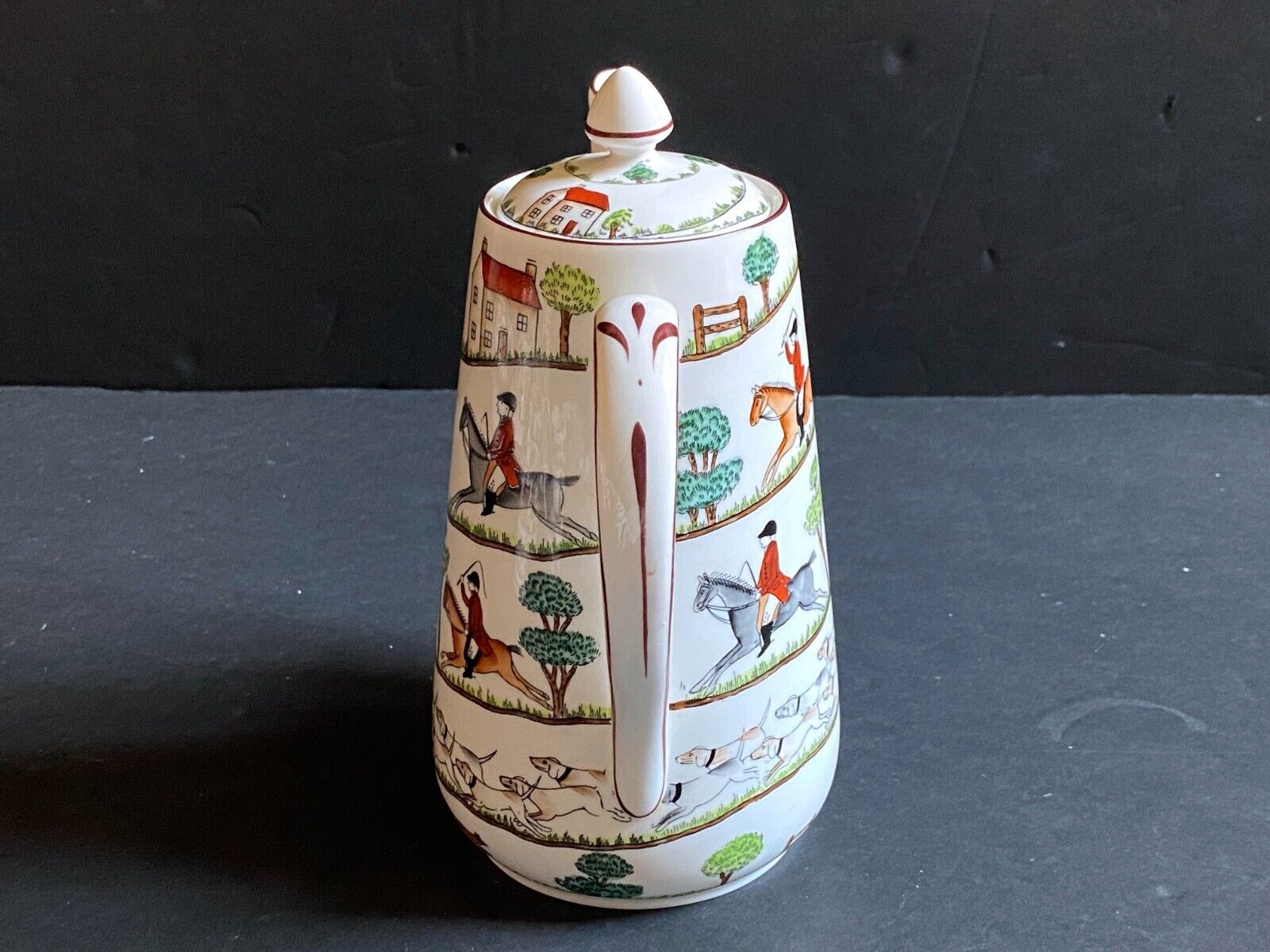 A magnificent "Hunting Scene" 3-piece coffee service by Crown Staffordshire, made in England. This set features a classic hunting scene pattern with vibrant colors and intricate details. Decorated with a hand-painted spiral design used by Royal Staffordshire pottery from the 1930s. The design spirals down the body and again around the lid, depicting horse riders in traditional hunting garb, hunting dogs and a fox chasing along a path past a red roofed house. The design, always popular with horse lovers and riders, has also been used more recently by Coalport and Wedgwood. The pot is stamped with the green Crown Staffordshire mark used since the 1930s to the base.