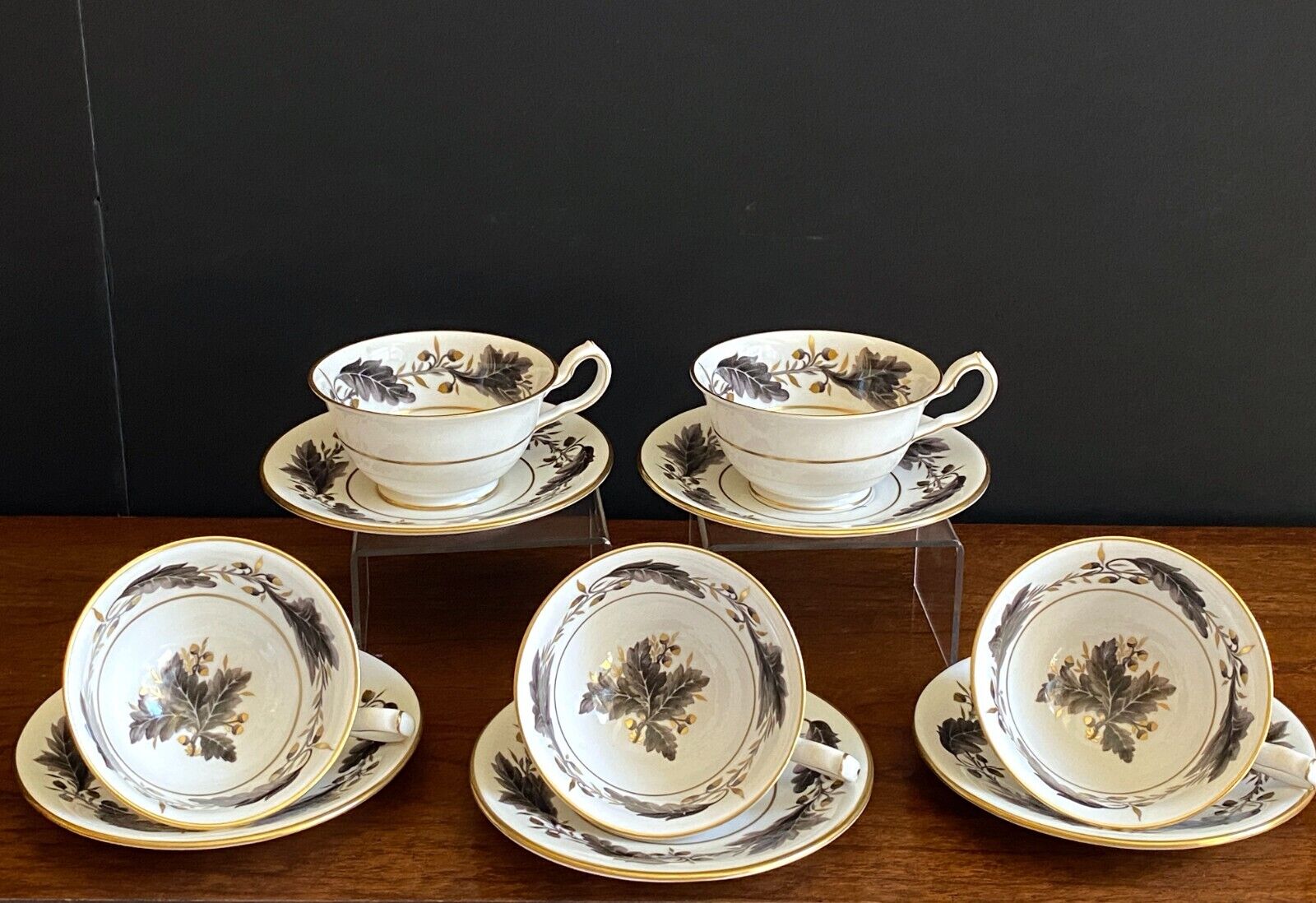 Set of 5 Royal Crown Derby teacups and sacucers , in "Portman Oak" pattern featuring a beautiful gold deco, dating back to circa 1940. Fine bone china, made in England.