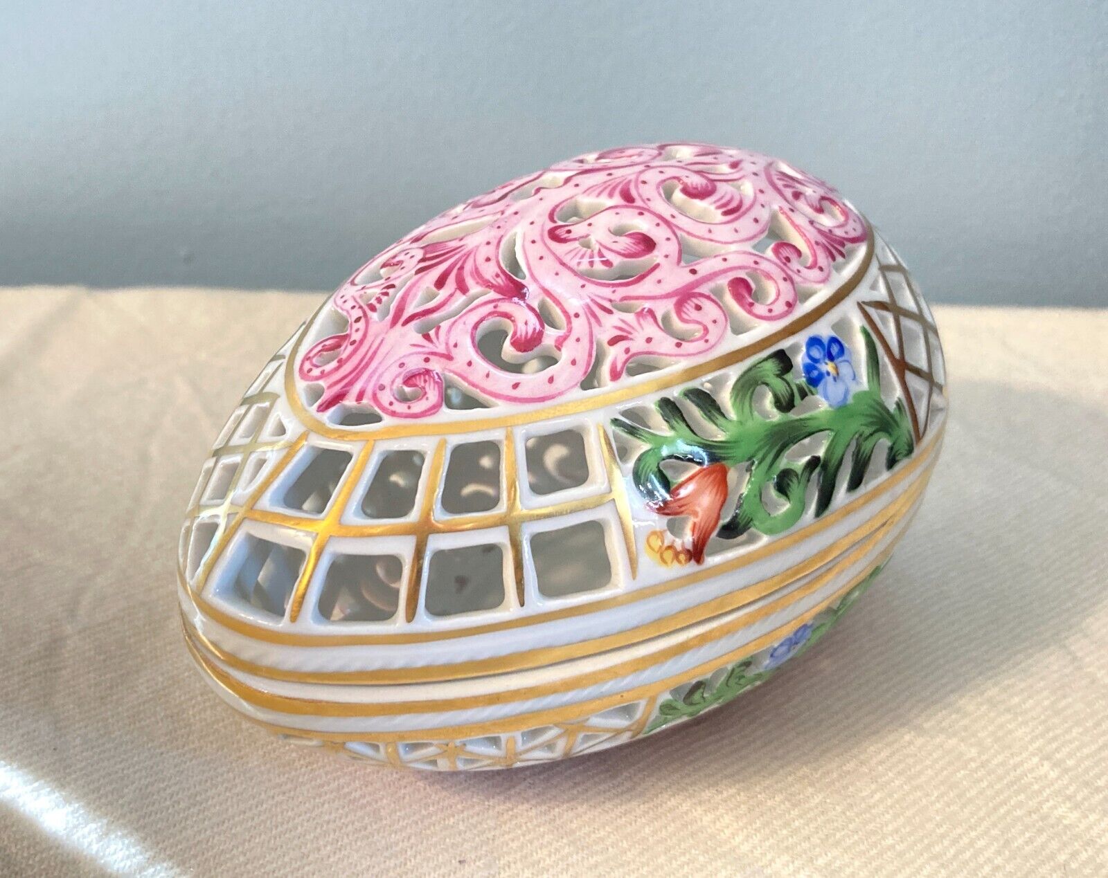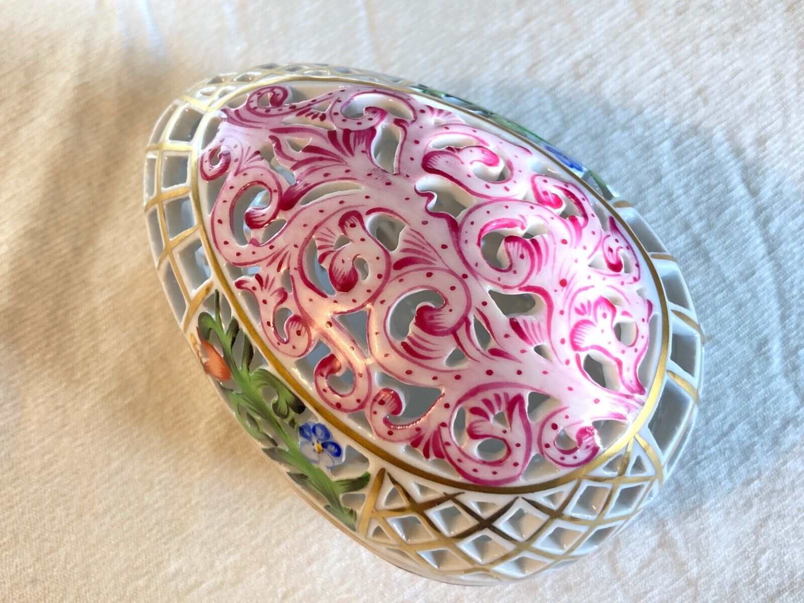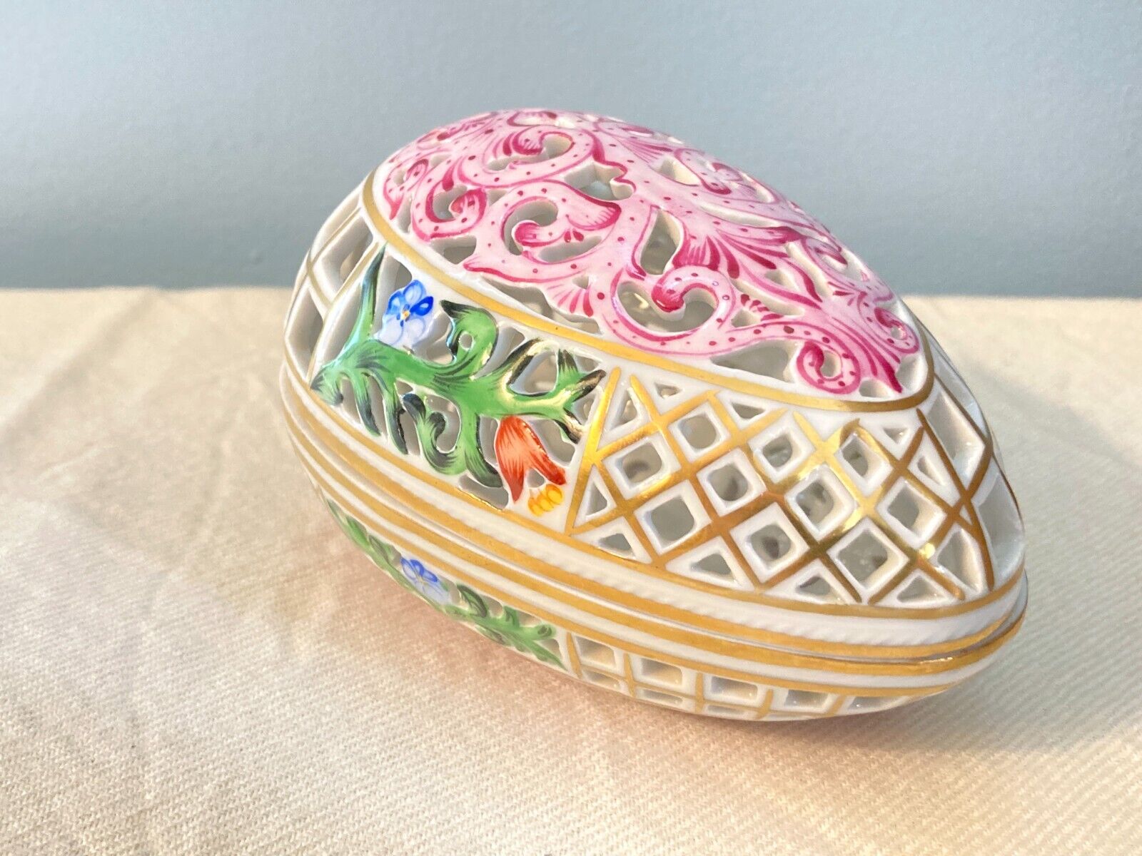 Herend Reticulated Egg covered bonbon Box / Trinket box, Multi Colors with Gold Accents, No. 6048/C, mint condition!