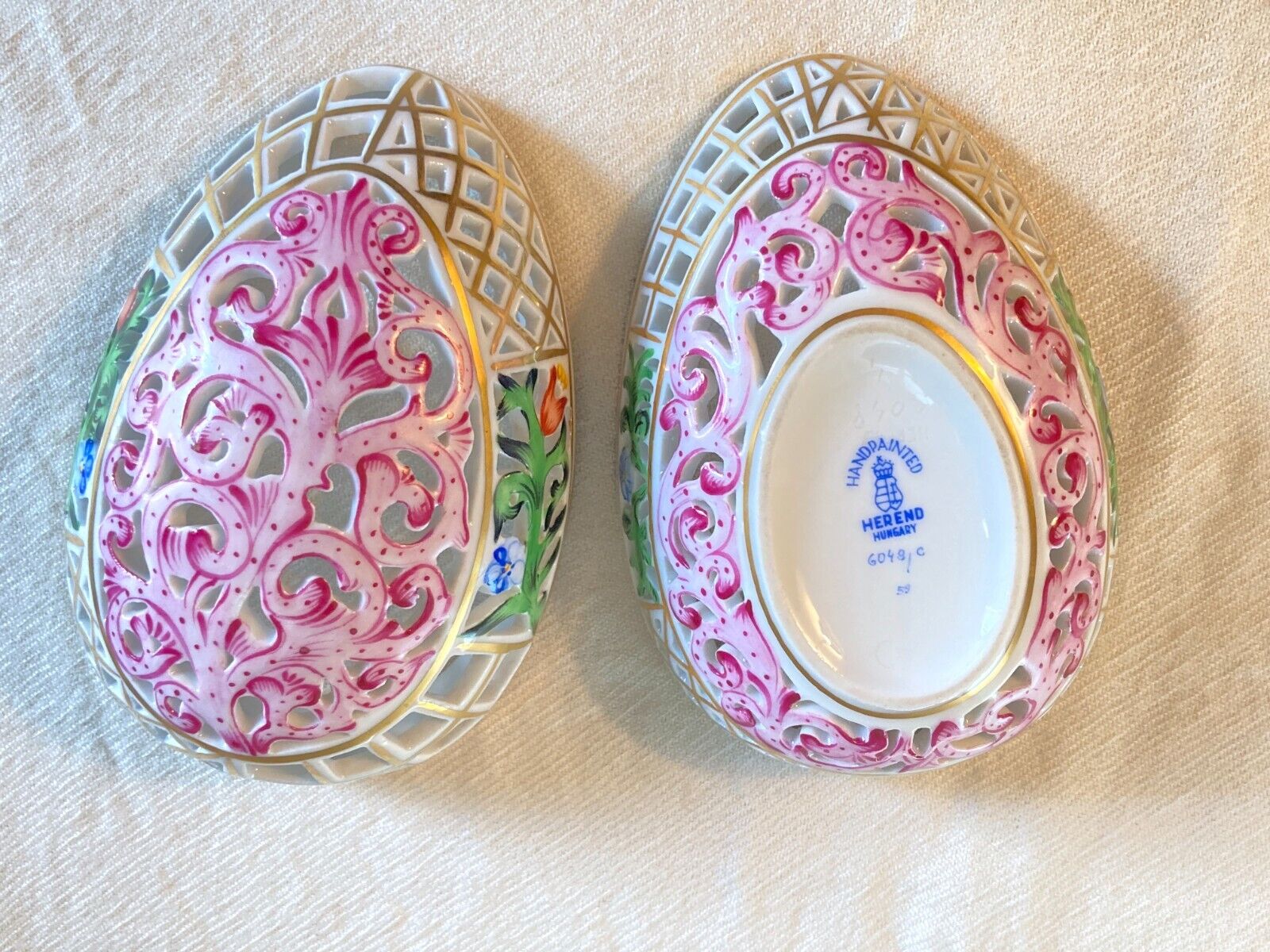 The openwork is outlined in gilt. It is marked Handpainted, Herend, Hungary, and 6048/c 160. It is 4 1/2" long by 3" wide by 2 5/8" tall.
