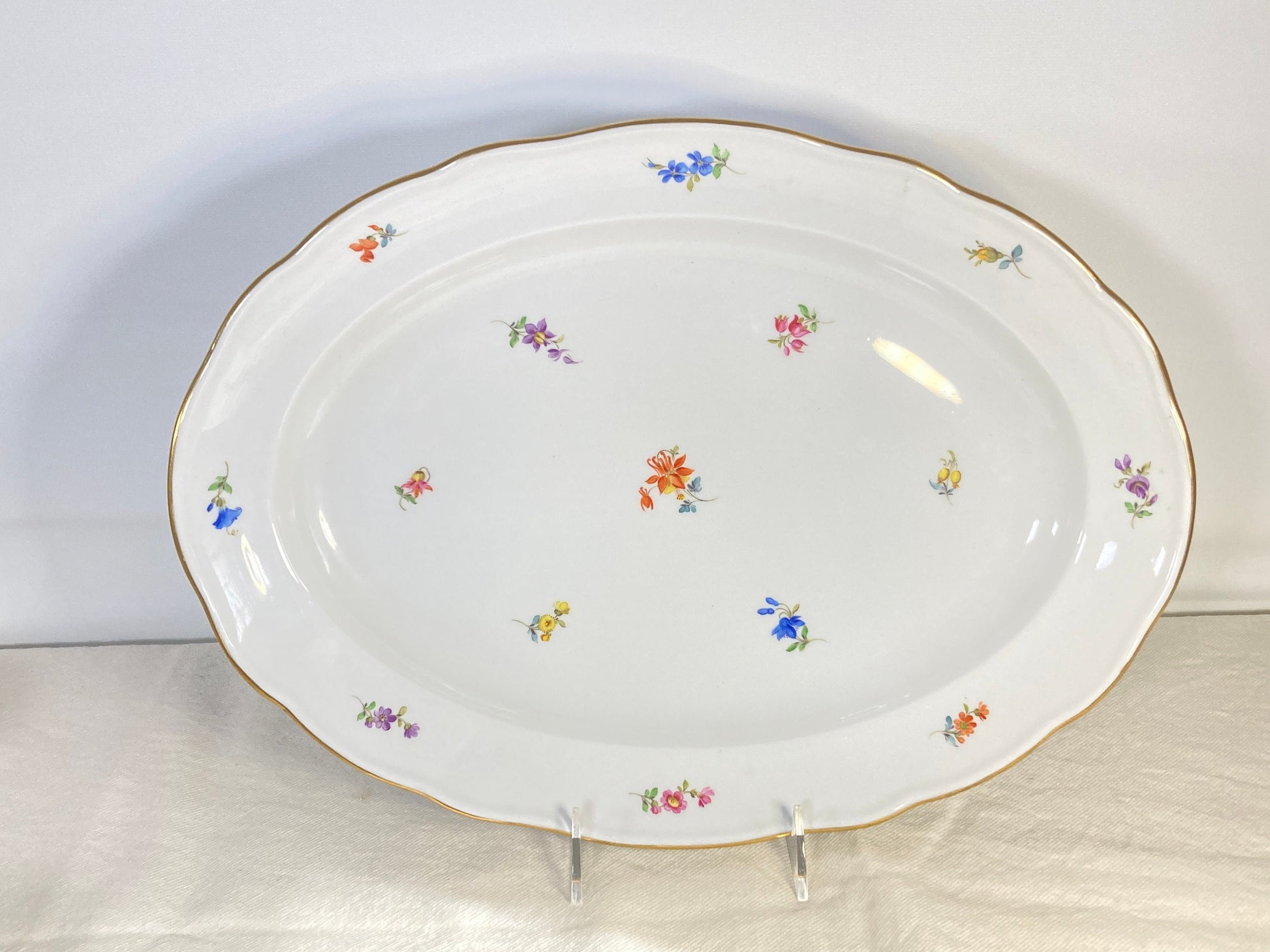 large Meissen oval platter decorated with scattered flowers and gilt rim, 16.5 inches x 12 inches, 1950s