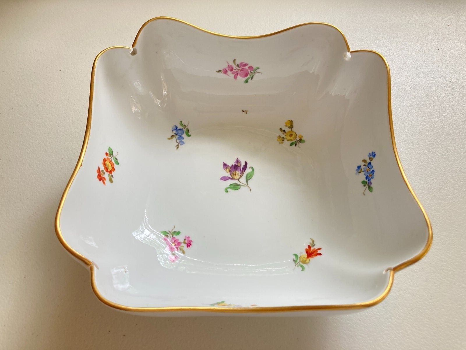 Meissen (1924-1934) large scalloped square serving bowl, gold rim, flora motif