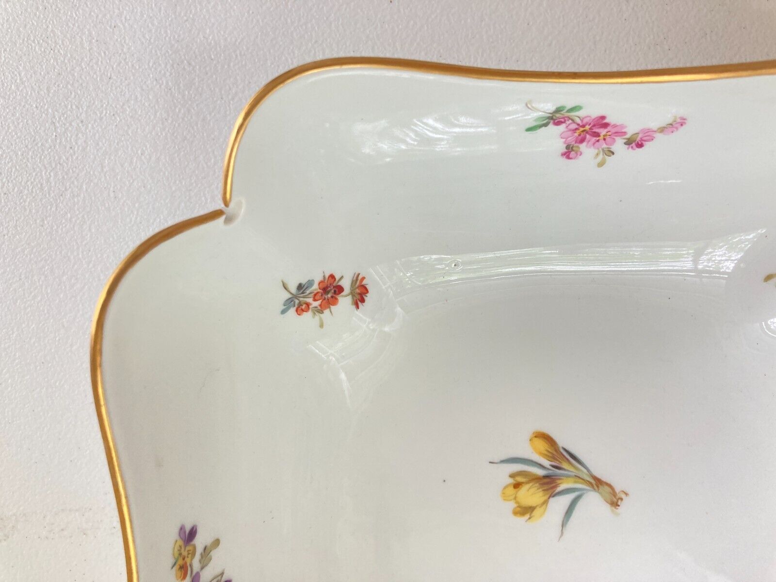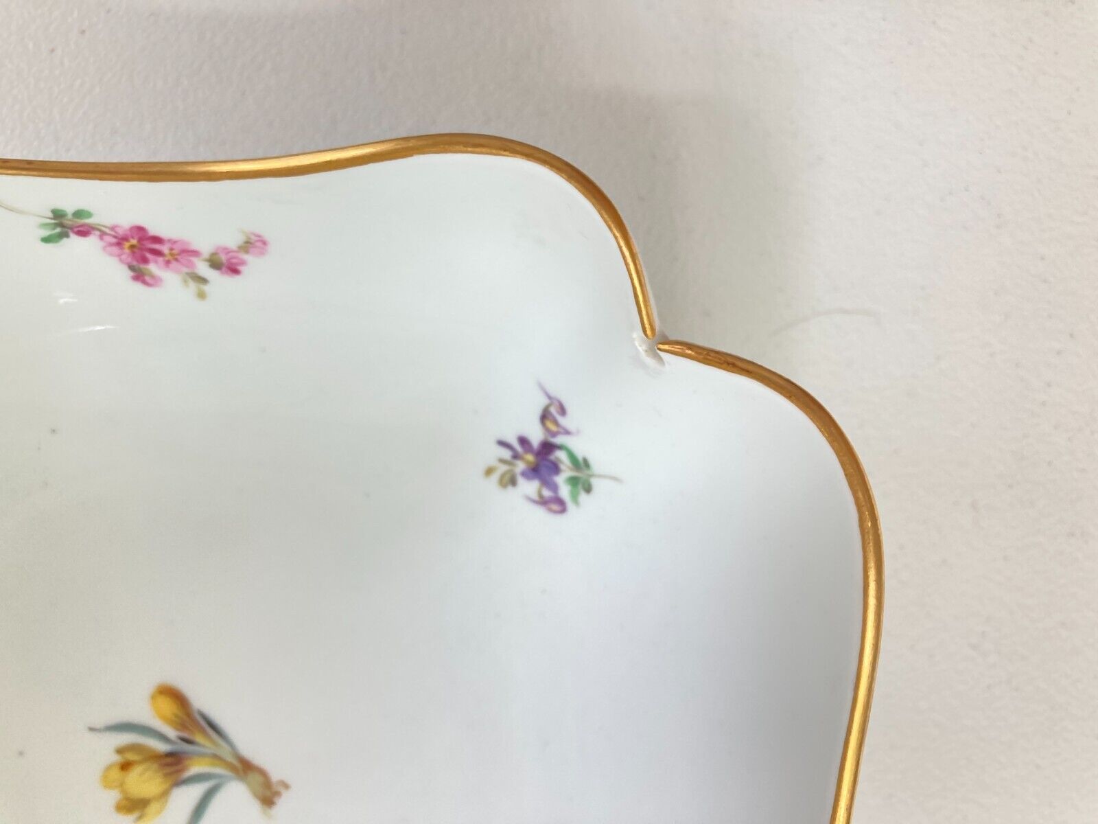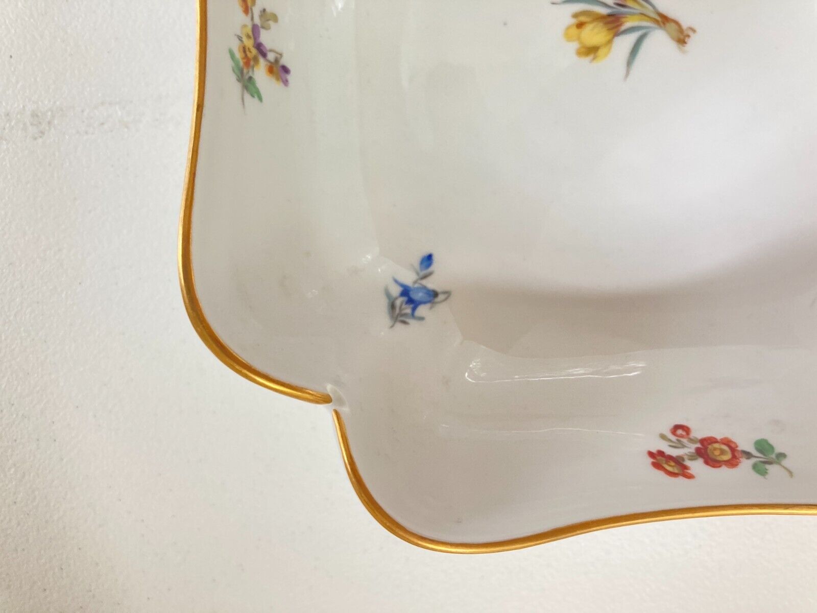 A Meissen (1924-1934) large scalloped square serving bowl, decorated with scattered flowers, gold rim and flower motif, mint!
