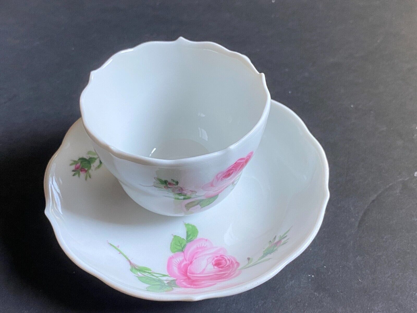 Vintage MEISSEN PINK ROSE Mocha Coffee set, coffee cups, sugar bowl, creamer. Made in Germany, 1st quality, with underglaze blue crossed swords. ca. 1930s. This teacup is decorated by the famous "Meissen Rose", one of the most popular decorations from the house of Meissen. The "Meissen Rose" first blossomed in the Biedermeier period and has since become one of the most prominent decors, noble tableware, hand-painted and precisely crafted, has been adorned by the magnificent flowers ever since. This lot ( 14 pieces) consists of: 1 lidded sugar bowl with rose finial, measuring 3 inches in height and 3 inches in diameter. The rose finial has very tiny fleabite 1 creamer, 3 inches in height 6 mocha cups, 2 5/8 inches in diameter, 2 inches in height, with twisted handles and scalloped edges 6 saucers, 3 inches in diameter, 1 inch in height All are in excellent condition with no chips, cracks, crazing, losses, damage, or repairs. Please feel free to contact us if you have any questions or would like to see more photos of this beautiful Meissen set. Thank you for your interest in our vintage porcelain collection! No exchange of return, If there is any problem please contact me so that I can sort it out. Thanks for visiting my shop