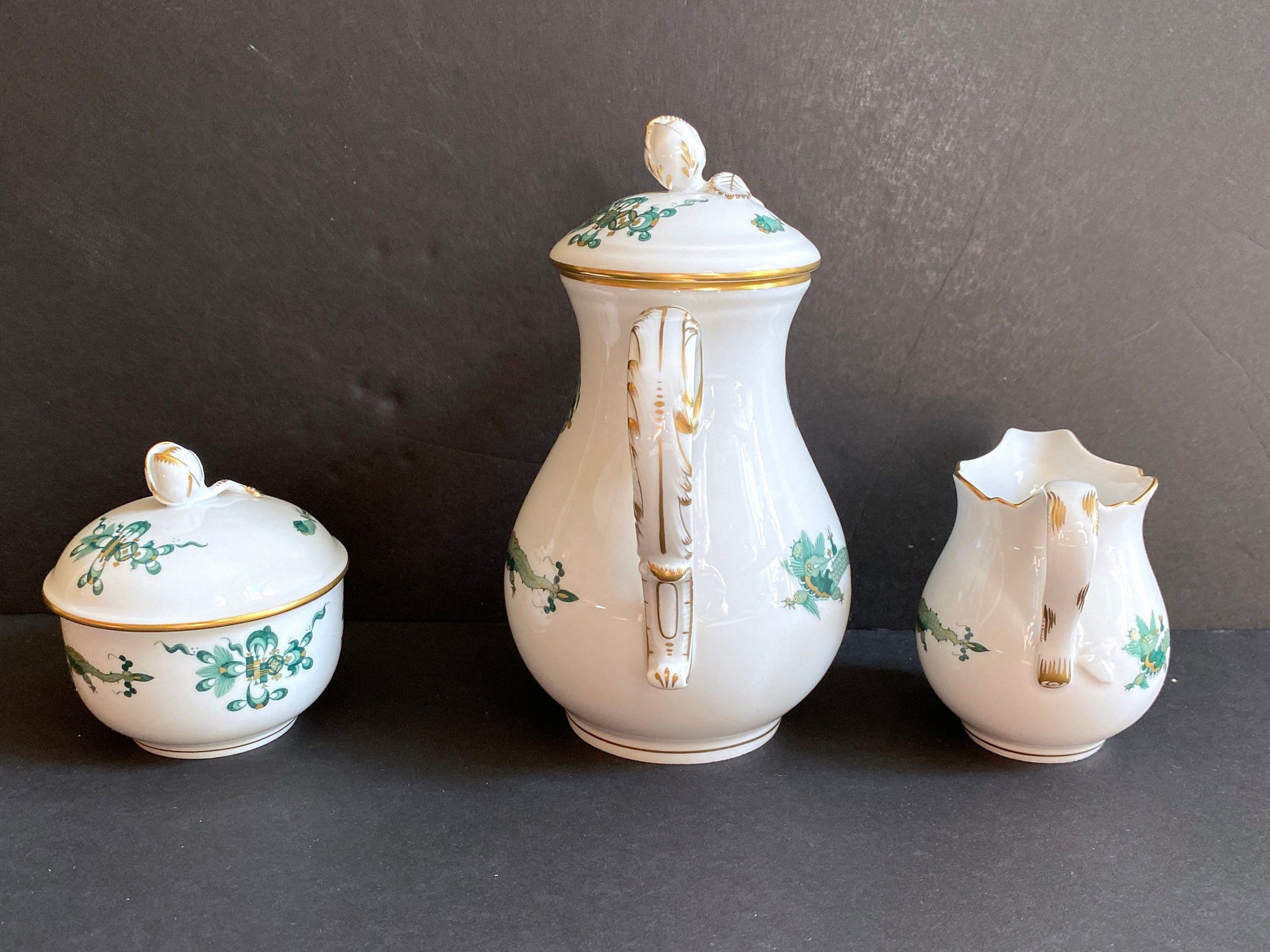 For sale is a lot of Meissen Reicher Court dragon (green) small /demitasse coffee service including pot, creamer and sugar bowl, decorated with green dragon, phoenix birds motif, scalloped edge with gold trim, 1st quality, underglaze blue crossed swords mark with an impressed number on the bases. Made in Germany. Highly collectible! in excellent condition! Like new!