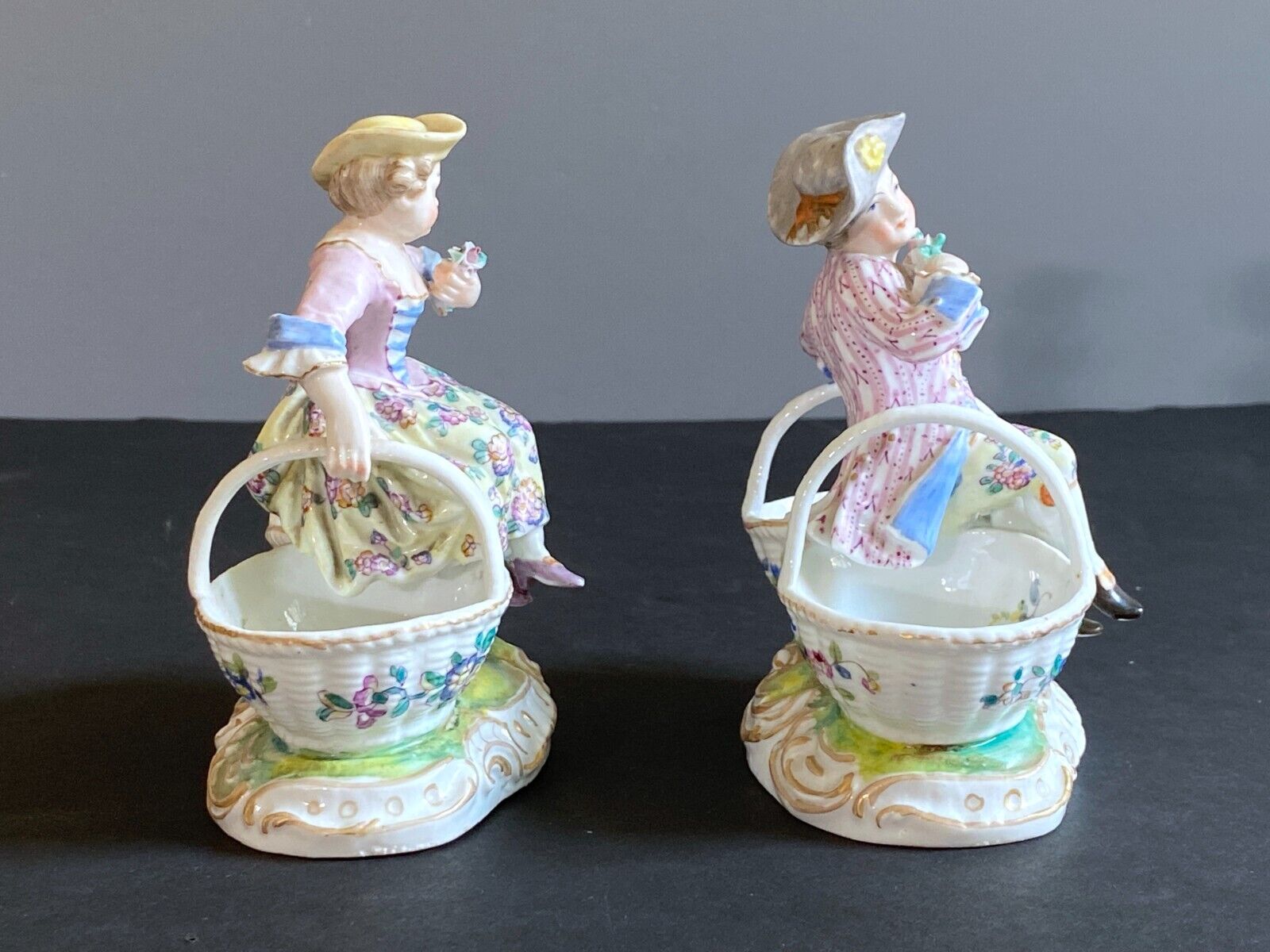 A pair of MEISSEN Figural Salt Cellars, depicting young man and woman seated a top of woven baskets. Measuring approx. 5.5" tall x 5" wide. In good condition with tiny losses to flowers in hands of the woman, otherwise in excellent vintage condition, with no chips, repairs, crazing, or cracks.