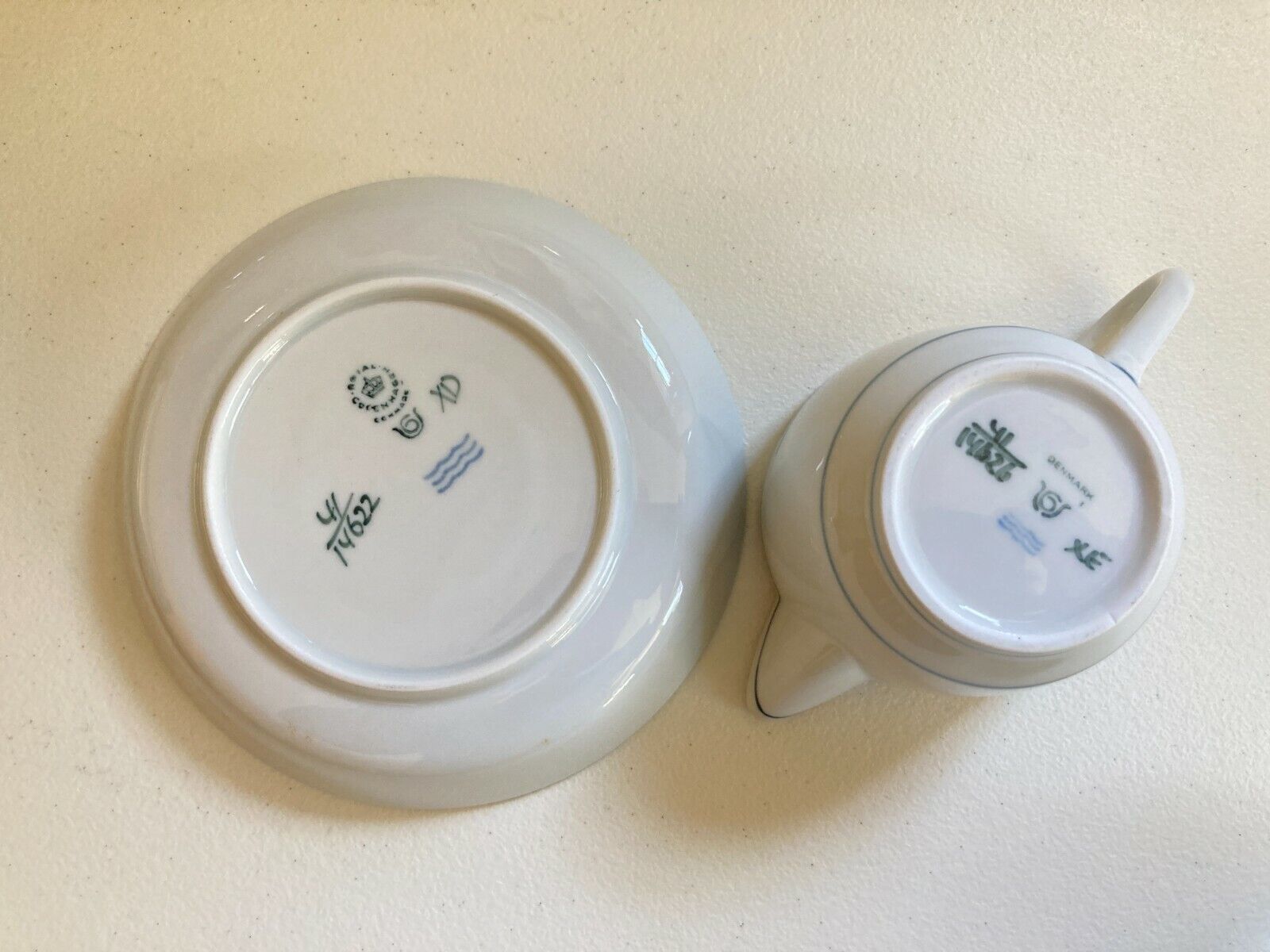 Gertrud Vasegaard for Royal Copenhagen "Gemina" hand painted Blue and White creamer, excellent! It is a pale blue with modernistic darker blue lines. High quality!