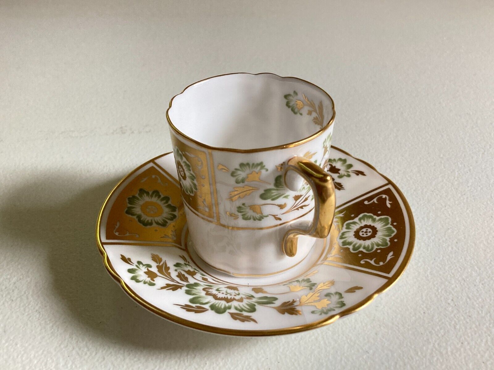A set of Royal Crown Derby demitasse /espresso coffee cups and saucers, famous "Green Derby Panel " pattern, bone china, made in England, Y976, highly collectible. A beautifully traditional design featuring tranquil flowers and foliage in green decoration set against alternating panels of pristine white and gleaming 22 carat gold