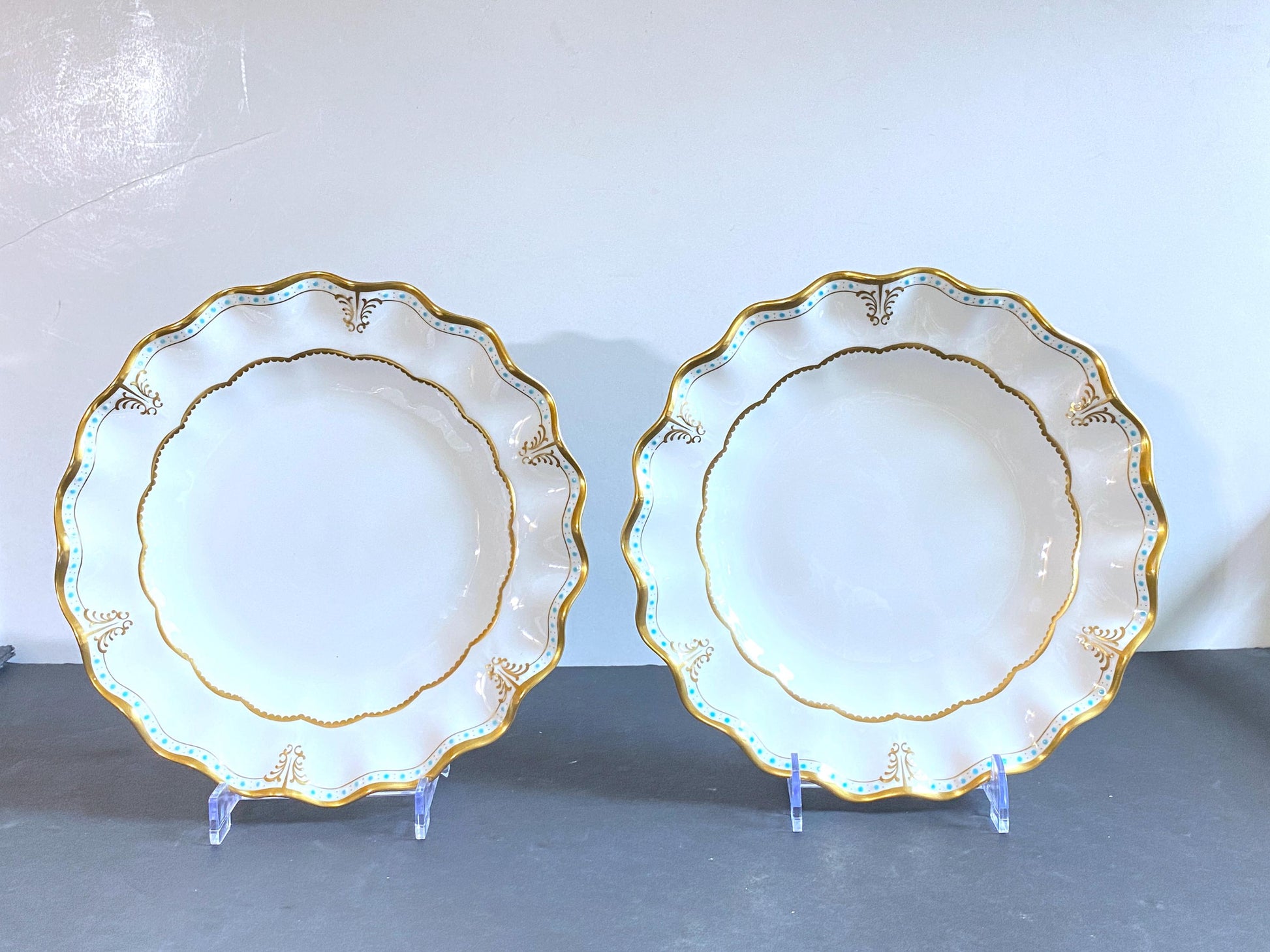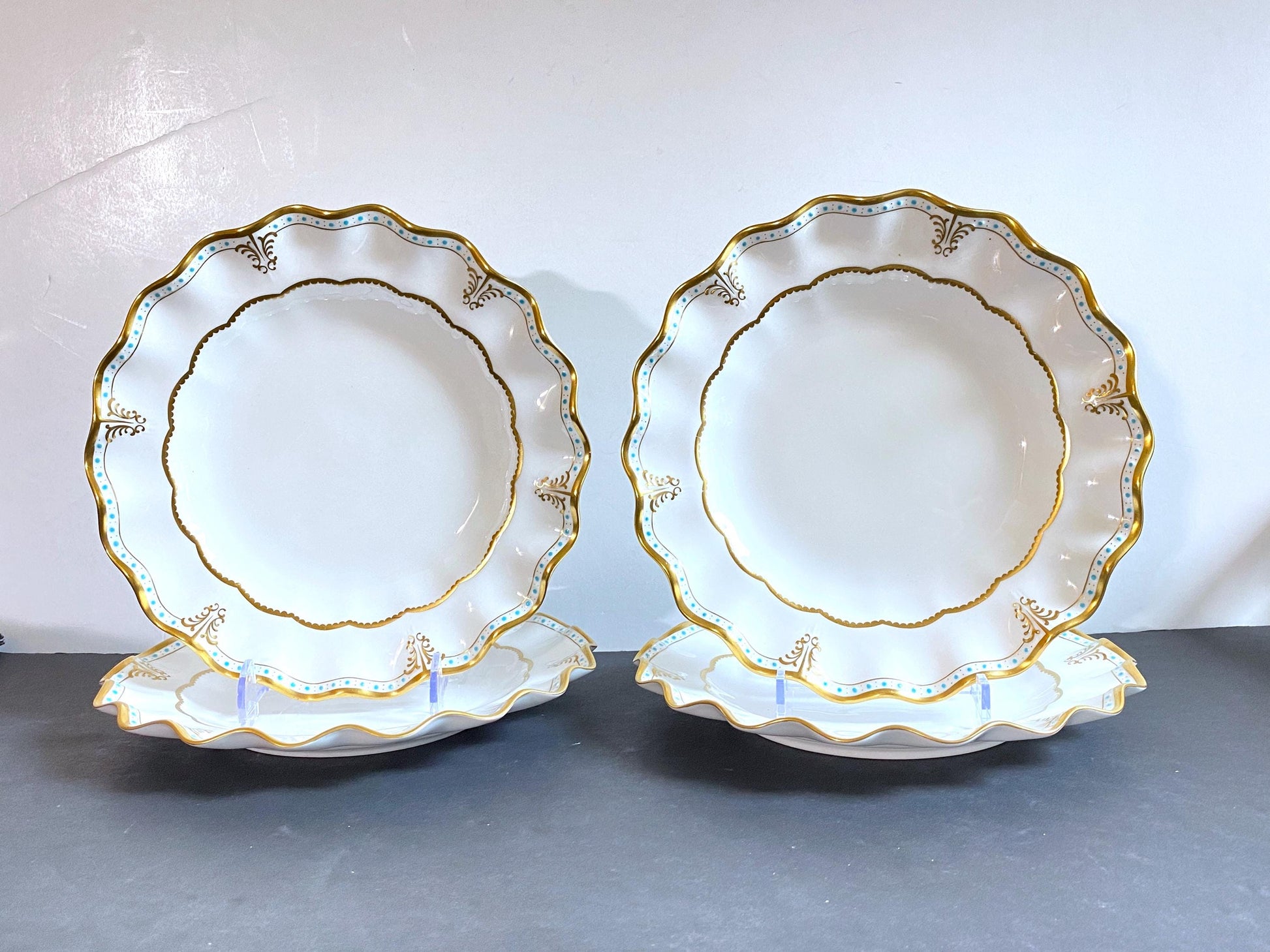 Four Royal Crown Derby "Lombardy" pattern dinner plates . The "Lombardy" pattern features an ornate gold and turquoise border. The plates have scalloped edges (Royal shape) with gold rims accented by a repeating pattern of raised turquoise dots.