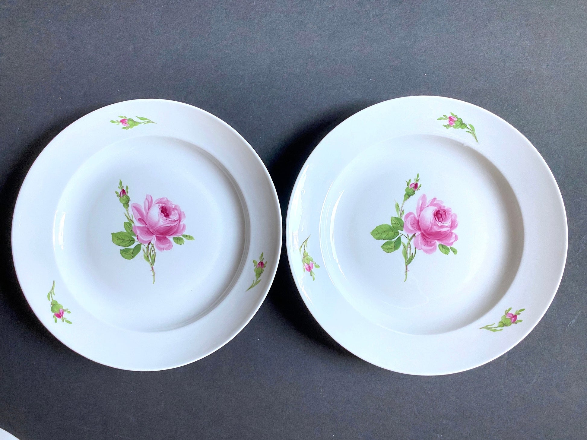 Set of 5 Vintage MEISSEN "Roses" bread and butter plates, 6 inches, ca. 1852-1870, made in Germany, ca. 1852-1870, were decorated by the famous "Meissen Rose", one of the most popular decorations from the house of Meissen. The "Meissen Rose" first blossomed in the Biedermeier period and has since become one of the most prominent decors, noble tableware, hand-painted and precisely crafted, has been adorned by magnificent flowers ever since.